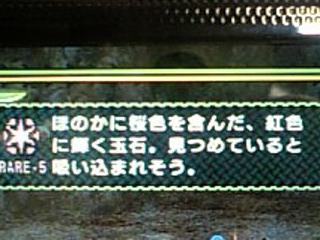 これですよ!!桜火竜の紅玉!!やりましたね!!レイアを倒し尻尾剥ぎ取りで出てきたときはもう、「おっしゃ!!!!」て叫びましたね!!レウスからはなにも取れないんですがね・・・・・。